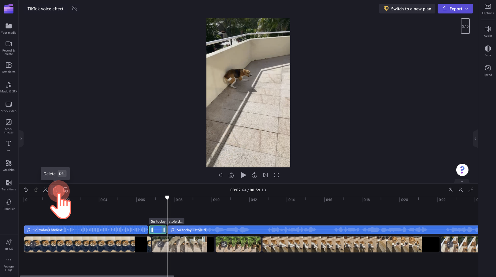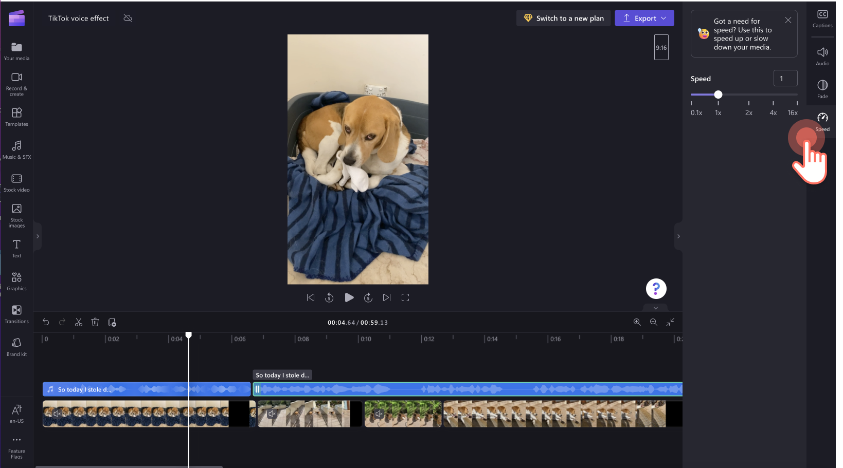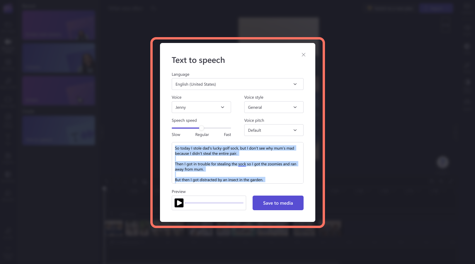 Но не е нужно винаги да използвате съществуващите гласове на Tiktok. Няма нужда да се влагате в бокс в. Създайте свой собствен гласов ефект с текста на производителя на реч в ClipChamp, който ви дава творческа свобода да издавате напълно уникални звуци на различни езици, акценти и скорости. Нашата технология Advanced AI Voiceover има изобилие от фини настройки и ефекти, за да оживее вашите идеи. По -добре е, че можете да използвате отново своя уникален звук за други видеоклипове в социалните медии и автоматично да генерирате надписи в clipchamp. Вижте този бърз урок.