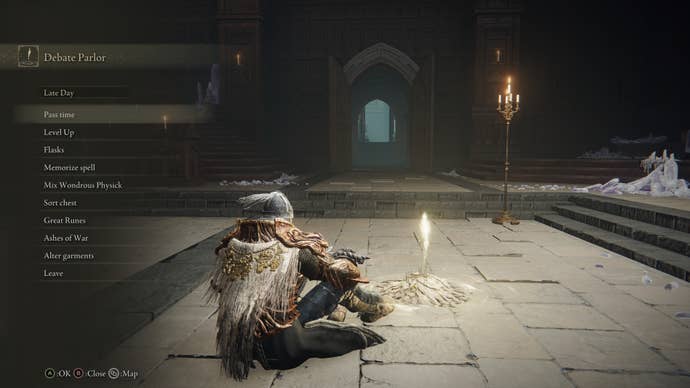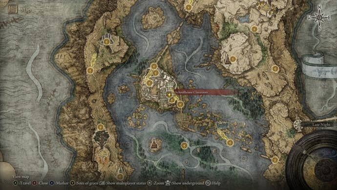 Започнете от мястото на благодатта, наречен Дебатен салон в Академия Raya Lucaria и се разходете през големите двойни врати, водещи в двора. Изкачете се по разрушените стълби вляво, минавайте покрай магьосниците, стрелящи по магия, вземете наляво и трезорете над парапета върху друг комплект стълби отдолу. Там ще видите друг магьосник. Преминете покрай тях, вземете още един ляв, след това Vault над друг парапет на покривите.