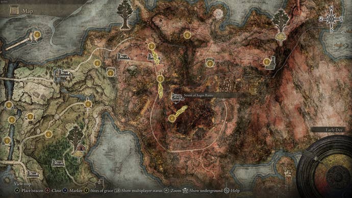 2. От Astray от Caelid Highway North Travel Пътуване направо на изток и скоро ще пристигнете в блатото в сърцето на Каелид. В северозападната част на блатото ще намерите улицата на мъдреци руини.