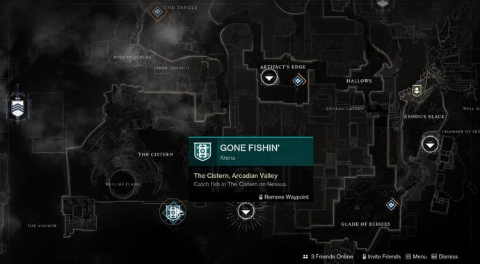 一旦誘餌,您就需要 找到釣魚點. EDZ,Nessus和Savathun的寶座世界有釣魚孔. 在導演中尋找藍色鑽石形指示燈以找到精確的位置.