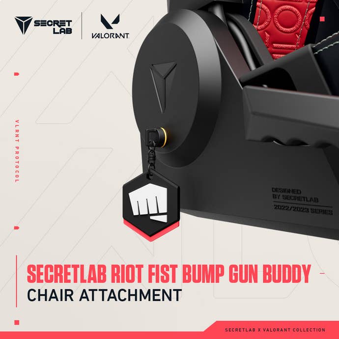 Игралното седалище SecretLab Valorant Edition също Разкрасен с неуловимия и ексклузивен Secretlab Riot Fist Bump Pundy Buddy Buddy Pailment от неговата страна -Вземете враговете си с този емблематичен физически жетон, който ви развеселява, докато стискате игрите си в комфорт, спечелен от мачове.